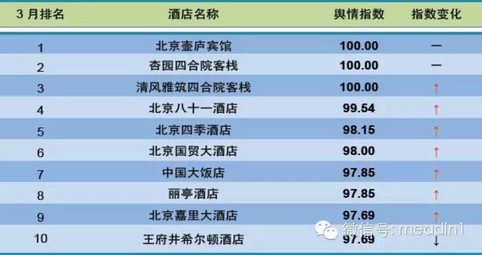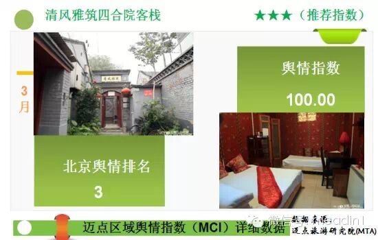 北京地區(qū)酒店輿情指數榜TOP20顯示,前十中,除了排名第一、第二的酒店的輿情指數持平以及排名第十的酒店輿情指數有所下降外,其他酒店輿情指數較上月都是上升的。四合院是我國特有的一種傳統(tǒng)式建筑,其中以北京最為典型。四合院與酒店的巧妙結合更是北京酒店的一大特色,吸引了一大批中外游客。本月四合院式酒店的表現就非常突出,在前十中占據四個席位,如榜單中的北京壺廬賓館、杏園四合院客棧等。充滿京味的四合院,齊全的設施,周到的服務,得到了中外游客的肯定,也帶動了四合院式酒店輿情指數的上升。