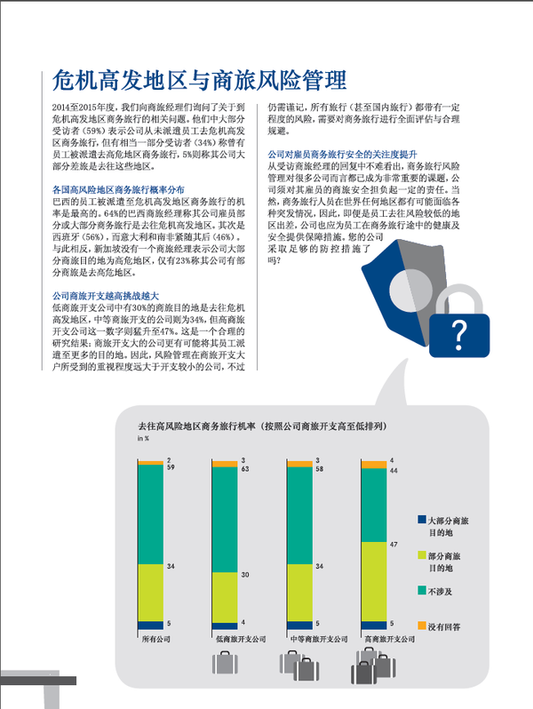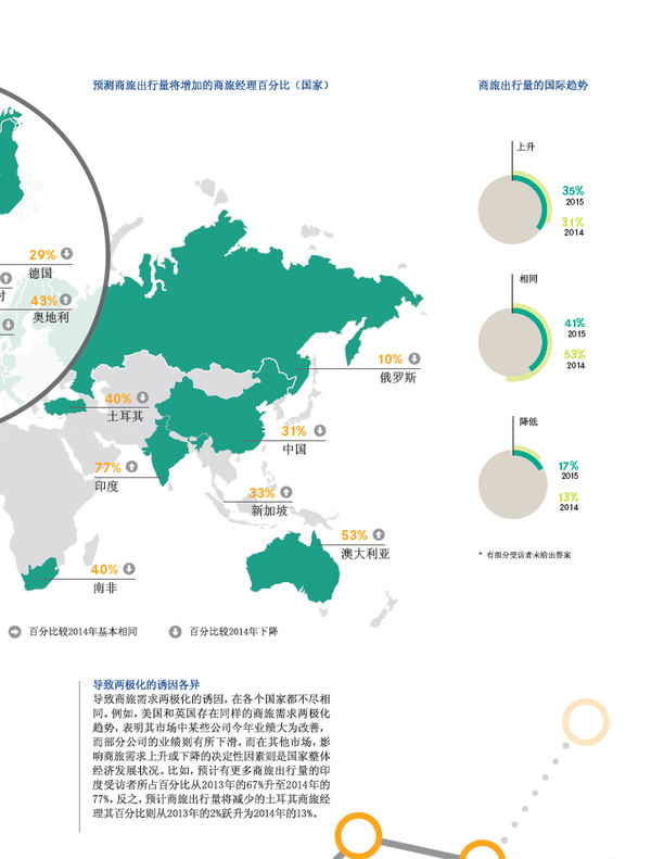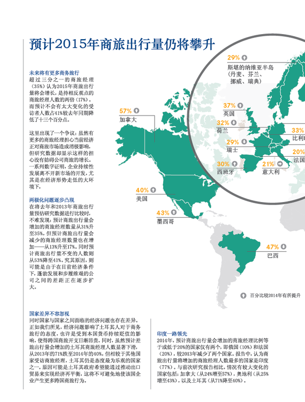 報告顯示,中國商旅經(jīng)理對未來一年的商旅市場持樂觀態(tài)度,他們中20%的受訪者表示中國經(jīng)濟發(fā)展正對商旅市場起著積極作用,31%的商旅經(jīng)理預測公司未來一年的商旅出行量仍將增加,而36%的商旅經(jīng)理相信2015年中國商旅市場商旅開支將總體上揚。值得關注的是,許多商旅經(jīng)理認為影響公司商旅開支增大的一大原因是因為中資企業(yè)正逐漸加大海外市場拓展力度。