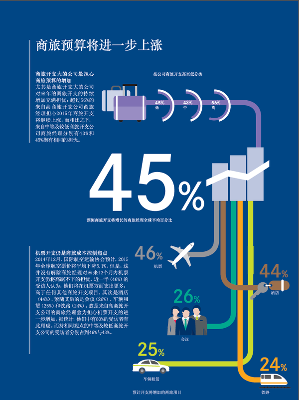 值得注意的是,在包括酒店、會議、汽車租賃等在內(nèi)的所有商旅成本中,機票開支仍是企業(yè)控制商旅成本的重點。雖然國際航協(xié)此前曾預計2015年全球航空票價將平均下降5.1%,但這并沒有消除企業(yè)對機票開支仍將居高不下的擔憂。在調(diào)查過程中,有近一半的企業(yè)商旅經(jīng)理認為,他們將在機票開支方面支出更多,高于任何其他商旅開支項目。